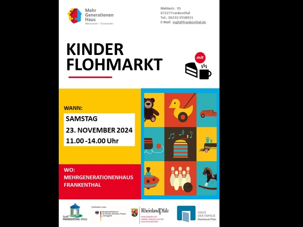 Am Samstag, den 23. November lädt der Sprach-Frauen-Treff aus dem MGH gemeinsam mit dem Mehrgenerationenhaus zum Kinderflohmarkt von 11.00 – 14.00 Uhr ein. Wetterunabhängig findet der Kinderflohmarkt in den Innenräumen des Mehrgenerationenhaus statt. An diesem Tag können Sie „Alles rund ums Kind“ erwerben.