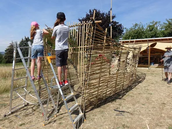 In der 2. Sommerferienwoche Montag, 31.7. bis Freitag, 4.8.2023 jeweils von 10:00 bis 16:00 Uhr für Kinder zwischen 7 und 11 Jahren, baut der Bildhauer Loïc Devaux mit Euch räumliche Gebilde aus Bambusstangen. Dazu werden dicke Bambusstangen gespalten, auf Maß gesägt und verwebt. Das Ganze wird von Fahrradschläuchen, die in Streifen geschnitten werden, zusammengehalten. Letztes Jahr ist ein bunt angemaltes Schiff mit riesigem Fahnenmast und Löwenkopf-Piraten-Flagge als großes Gemeinschaftswerk entstanden. Und natürlich kommt das freie Spielen nicht zu kurz.